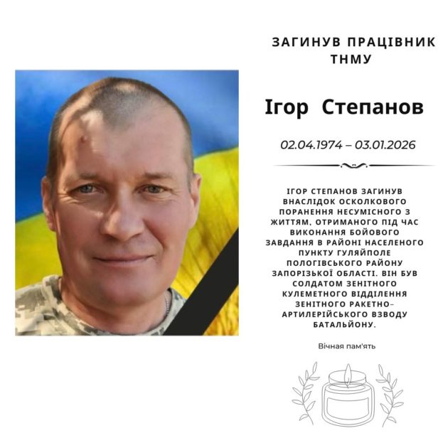 Ігор Васильович Степанов (02.04.1974 – 03.01.2026) був працівником адміністративно-господарської частини ТНМУ. Він віддав своє життя за Україну під час виконання бойового завдання.