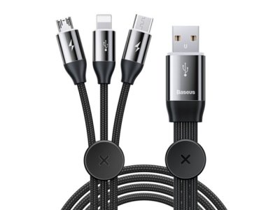 Багатофункціональний кабель з роз’ємами USB-A, USB-C, Micro-USB та Lightning. Його довжина складає 2 метри. Виконує функції синхронізації. Має MFI і відповідає всім правилам, які вимагаються від компанії розробника. Завдяки шкіряному клямці вам не потрібно скручувати аксесуар, його можна легко скласти, щоб зайвий раз не шкодити аксесуару.