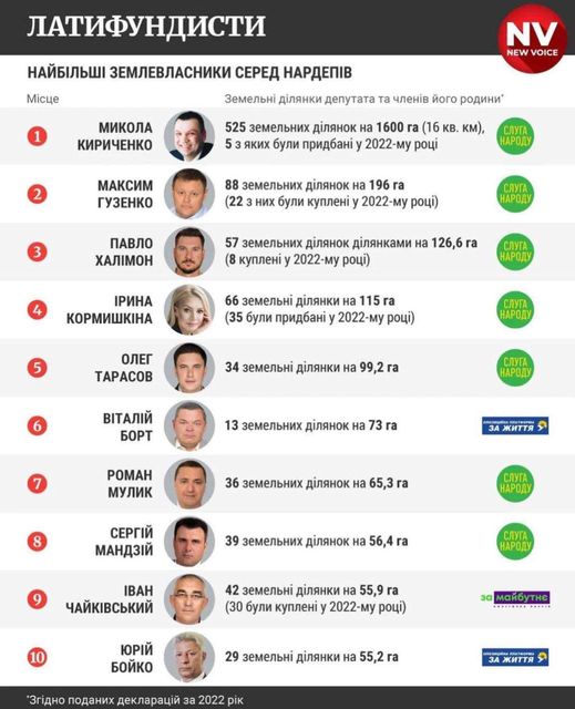 Тут наведені дані про земельні володіння депутатів та членів родини за даними з відкритих декларацій.
