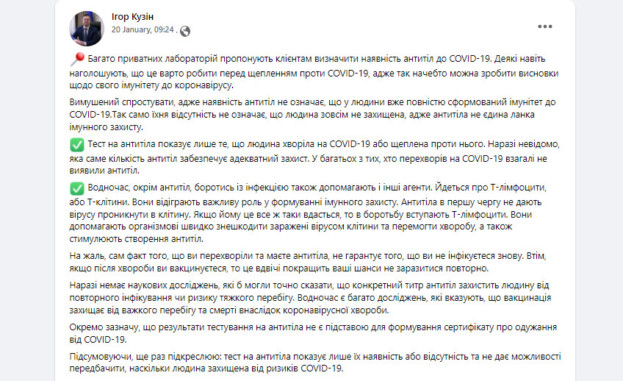 Головний санітарний лікар Ігор Кузін заявив, що наявність антитіл не означає, що у людини повністю сформований імунітет від COVID-19, зазначив Кузін у Facebook .