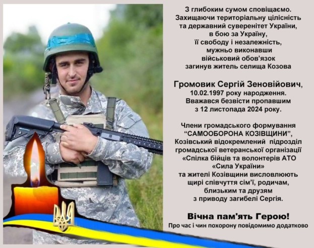 Учора, 10 лютого, Сергію мало б виповнитися 28 років. Проте, тепер йому назавжди 27… З сумом повідомляю про загибель нашого земляка, мешканця селища Козова Громовика Сергія Зеновійовича.