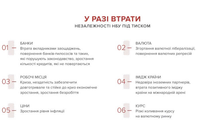 – 47 годин. Саме стільки часу відділило твердження нового Президента про пріоритетність макростабільності через незалежність НБУ і вихід у публічний простір апологетів олігархічного банкінгу. Посилення тиску на інституцію є спробою дискредитувати її рішення, пов’язані з виконанням призначення центробанків. І це не приватна проблема НБУ, а виклик для добробуту кожного громадянина, – йдеться у заяві Нацбанку.