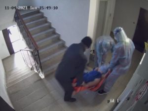Жінку «пакують» в ліфт, дверцята якого кілька разів стискають ноги хворої, потім її витягують з ліфта та знесилено опускають на підлогу. При всьому цьому жінка була у футболці на короткий рукав, яка задерлась, оголивши живіт, та спортивних штанях, без шкарпеток. Чоловік, який випадково опинився на шляху евакуації напросився допомогти. Медики, звичайно ж не відмовили, але жоден з них не спромігся дати чоловікові рукавички та маску.