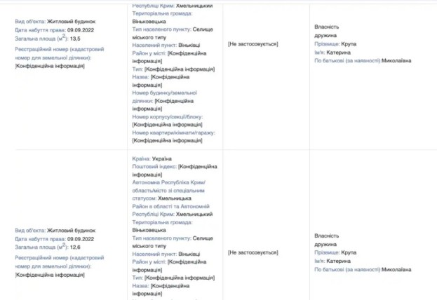 Невістка голови МСЕК купила чотири житлових будинки у 2022 році. Всі вони знаходяться у Хмельницькій області. Також вона купила два нежитлових приміщення у Хмельницькому, але вже у 2024 році.