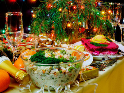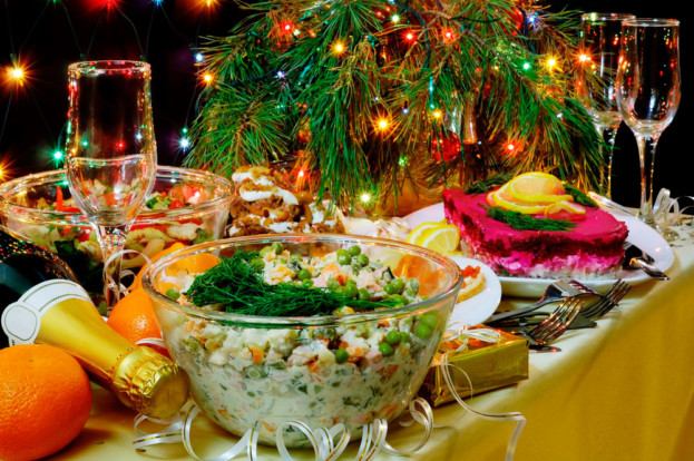 У своїх підрахунках орієнтувалися на святковий стіл для 4-х осіб, адже саме такою є середньостатистична родина. У нашому меню – традиційний салат олів’є, нарізка (м’ясо, ковбаса, риба, сир), фрукти, солодощі, бутерброди та алкоголь.