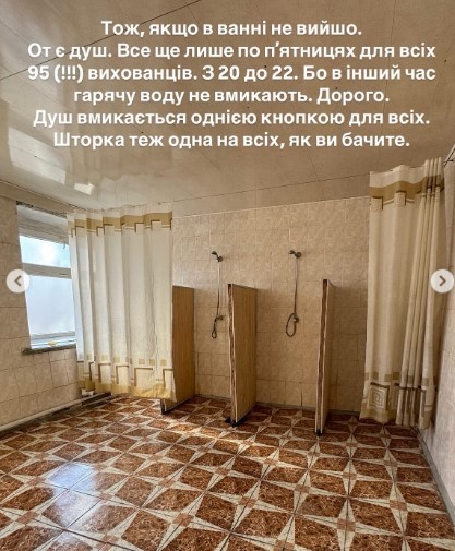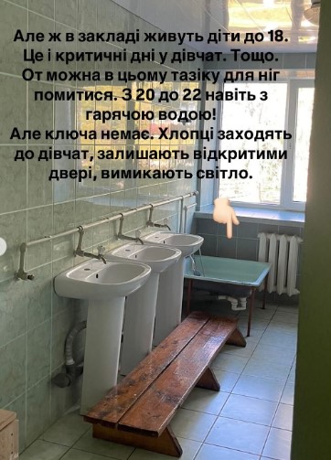– Поділюся зовсім трохи фото того, в яких умовах живуть наші діти. Зауважу одразу, що на цей заклад з бюджету йде майже 20 000 000 грн на рік. Скільки іде благодійних коштів встановити неможливо, – написала Ірина Мірошниченко. – Діти у закладі можуть помитися лише раз на тиждень в п’ятницю з 20 до 22 години. А у туалеті немає ані кабінок, які б забезпечували дітям приватність, ані туалетного паперу, ані гарячої води. Біля кабінету директора під ключем є красива відремонтована ігрова кімната! З купою іграшок, частина з яких в упаковці. Чи бувають тут діти? Ні. Це кімната з маршруту “для перевірок і волонтерів”. Ніхто з опитаних мною дітей там не бував.
