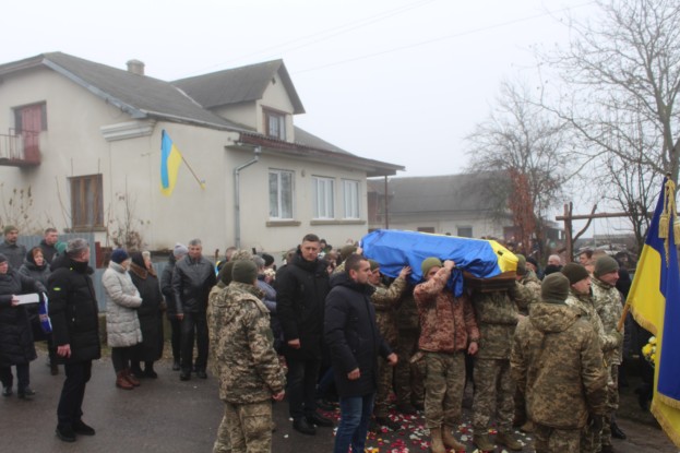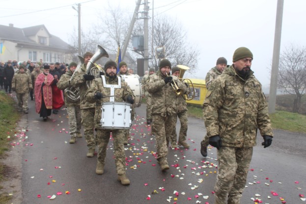 Похоронна процесія пройшла центральною вулицею села під супровід військового оркестру. Останню дорогу захисника встелили пелюстками квітів.