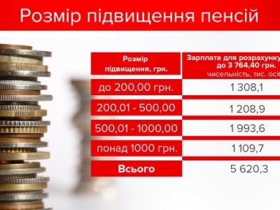 По-перше, для 5,6 млн. громадян буде підвищено розмір пенсії. Сума підвищення додаткових виплат коливатиметься від 200 до 2 тис. грн. для окремих категорій пенсіонерів.