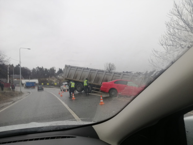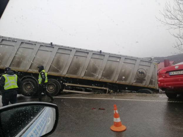 У селі Кровінка Теребовлянської громади щойно трапилося аварія. У кювет злетіла фура, зіткнулася з легківкою “Фольксваген” та зупинилися прямо перед людським подвір’ям. При цьому кабіну фури вивернуло.