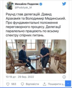 Радник керівника Офісу президента України і один із представників української делегації Михайло Подоляк повідомив, що переговори розпочалися з раунду глав делегацій Давида Арахамії (від України) та Володимира Мединського (від Росії).