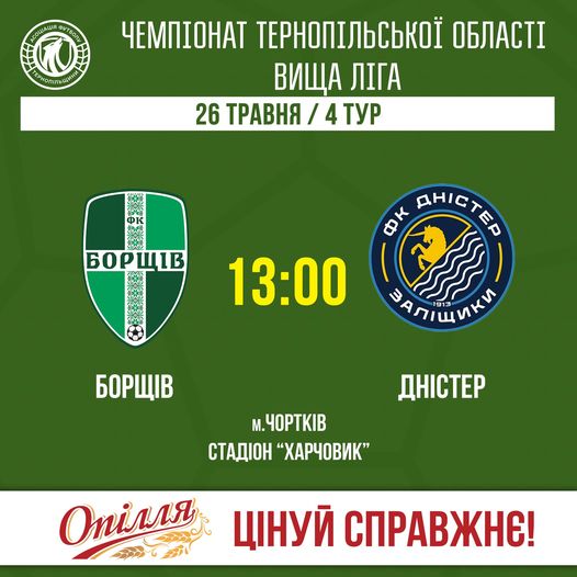 – У зв’язку з жалобою оголошеною в Борщівській громаді, матч 4-го туру вищої ліги чемпіонату Тернопільської області з футболу ФК «Борщів» – «Дністер» (Заліщики) відбудеться у Чорткові на стадіоні «Харчовик». Початок о 13:00, – йдеться в повідомленні Асоціації футболу Тернопільщини.