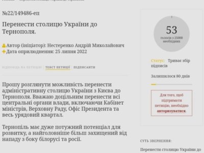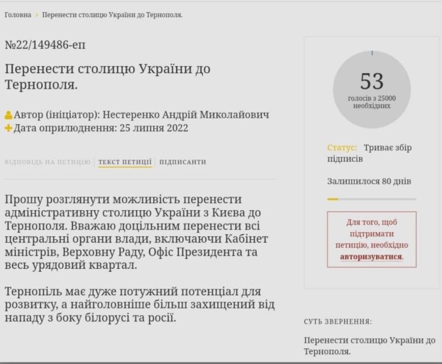 – Прошу розглянути можливість перенести адміністративну столицю України з Києва до Тернополя. Вважаю доцільним перенести всі центральні органи влади, включаючи Кабінет міністрів, Верховну Раду, Офіс Президента та весь урядовий квартал. Тернопіль має дуже потужний потенціал для розвитку, а найголовніше більш захищений від нападу з боку білорусі та росії, – йдеться в тексті звернення Андрія Нестеренка.