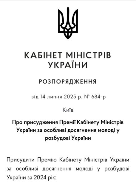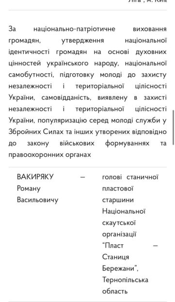 Голові станичної пластової старшини Національної скаутської організації «Пласт»-станиця Бережани Роману Вакиряку присуджено премію Кабінету Міністрів України за особливі досягнення молоді у розбудові України за 2024 р.