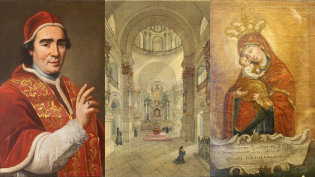 Римський Папа Климент XIV, оригінальний вівтар Успенського собору на малюнку Тараса Шевченка і коронований образ Почаївської Богородиці