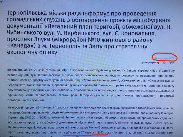 Виявляється 27 вересня в Тернополі проходили громадські слухання щодо містобудівної документації мікрорайону нижня Канада (район 23-ї школи). Про це повідомив тернополян Андрій Будзінський.