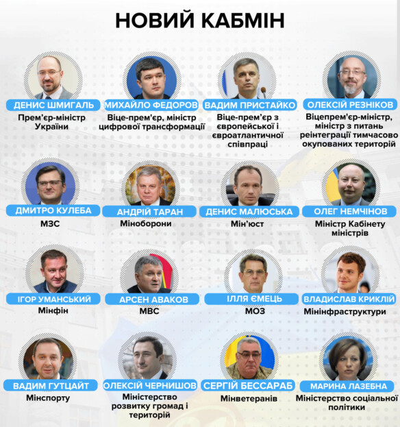 Своє місце у новому уряді зберегли міністр внутрішніх справ Арсен Аваков, міністр інфраструктури Владислав Криклій, віцепрем’єр-міністр Михайло Федоров, міністр закордонних справ Дмитро Кулеба та міністр юстиції Денис Малюська.