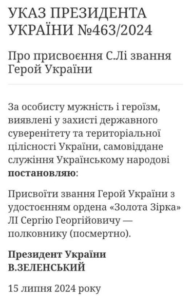 Кременчанину, заступнику командира 85 окремого батальйону 105 бригади ТрО полковнику Сергію Георгійовичу Лі (позивний “БРЮС”) присвоєно звання Герой України посмертно.
