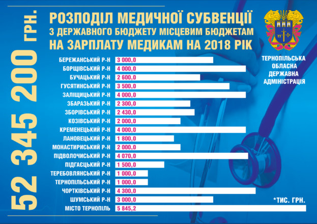 55 млн. грн. виділив уряд із медичної субвенції на Тернопільську область, щоби 2018 рік завершити без заборгованостей по зарплатах для медиків. Ці кошти розподілять між районами відповідно до кількості населення та фінансових можливостей райбюджетів. За відповідні зміни проголосували 28 листопада депутати обласної ради.