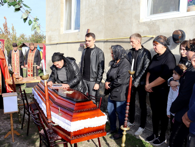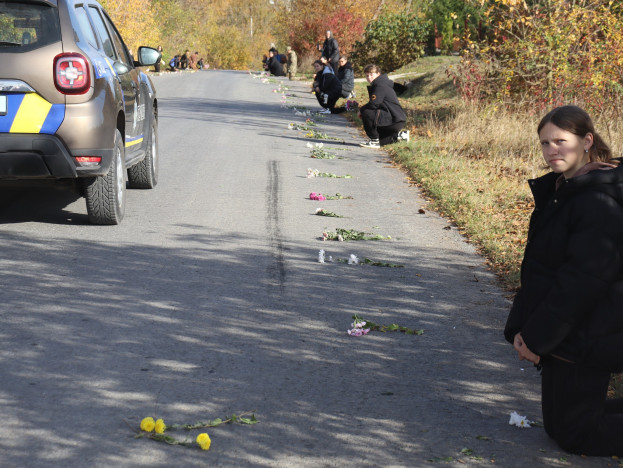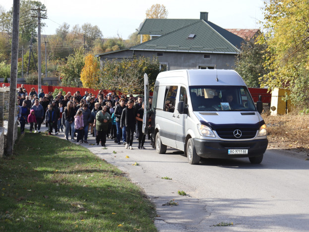 Дорога, встелена різнобарвними квітами, золоте листя на деревах, синє небо, сліпучо-біле сонце… Вздовж дороги десятки людей на колінах… Але це тільки штрихи до картини, яка творилася сьогодні, 24 жовтня, у Романовому Селі. Бо все інше чорний-чорний смуток з гіркими сльозами і щемливою тугою: громада зустрічала загиблого Олександра Ящука.