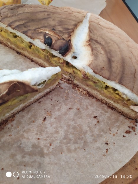 Начинка: 4 жовтки, 0,5 склянки цукру, 1 уп. вершкового пудингу (40 г), 1 уп. ванільного цукру, 400 г ревеню.