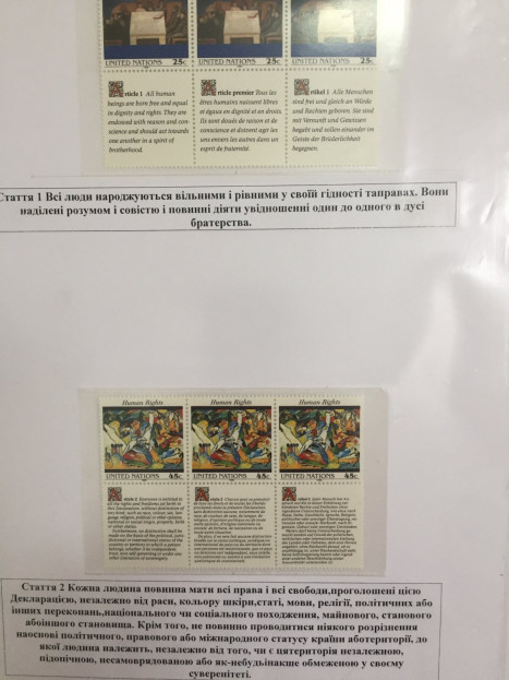 Цей найважливіший проект Поштової адміністрації ООН нагадує нам засобами філателії про надії, старання і успіхи людей усього світу, що були причетні до справи захисту прав людини і її основних свобод. Але сама ООН не готова до захисту цих прав. Трохи довго, але дозвволю собі зацитувати Нобелівську промову Олександри Матвійчук.