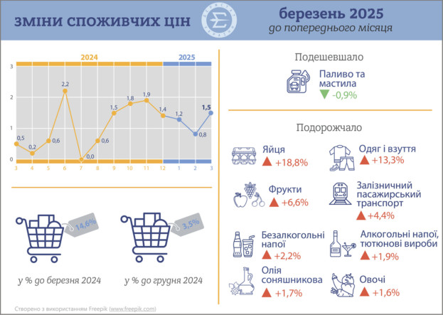 Споживчі ціни у березні 2025 року зросли в середньому на 14,6%, порівняно з аналогічним місяцем попереднього року. В лютому цей показник становив 13,4%.