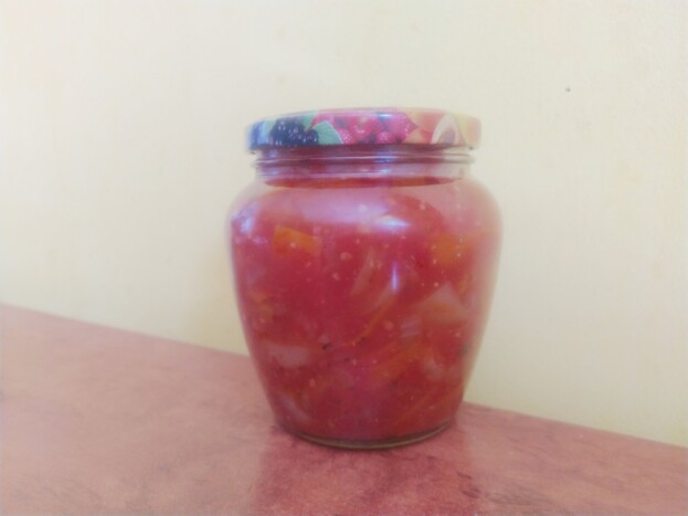 Перець солодкий – 1,5 кг, помідори – 2 кг, цибуля – 1 кг, морква – 0,5 кг, олія – 100 мл, цукор – 5 ст. л., сіль – 1 ст. л., оцет 9% – 1 ст. л., базилік сушений – 1 ст. л., перець чорний горошком – 15 шт.
