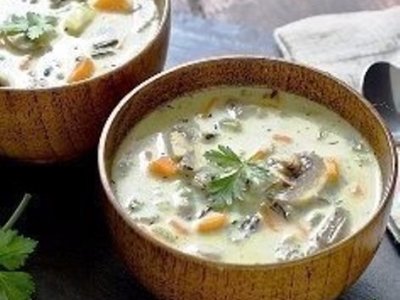 Вимийте у проточній воді куряче м’ясо. Крильця розріжте навпіл (якщо використовуєте інше м’ясо, розріжте на порційні шматочки). Увімкніть мультиварку в режим «жарка» і додайте в каструлю оливкової олії. Дайте каструлі трохи нагрітись і обсмажуйте курячі крильця по 6-8 хвилин з кожного боку. Очистіть і вимийте цибулю й моркву, наріжте їх півкільцями (або дрібно) і додайте в каструлю. Обсмажуйте разом з куркою, часто перемішуючи, ще 10 хвилин. Гриби вимийте, трохи просушіть і наріжте пластинками. Додайте у каструлю й обсмажуйте все разом до повного випаровування води, поки гриби стануть трішки золотистими (близько 10-12 хв.). Додайте в каструлю ложку борошна, все перемішайте. Тонкою цівкою влийте вершки, розмішайте. Приправте суп сіллю і перцем. Промийте рисову крупу і додайте її в каструлю, залийте гарячою водою. Увімкніть режим «тушіння» на 45 хвилин. Після закінчення програми додайте в каструлю лавровий лист, дрібно нарізану петрушку і дайте супу настоятися ще 10-15 хвилин під кришкою. Подаючи суп на стіл, додайте в кожну тарілку трохи зелені петрушки. Смачного!