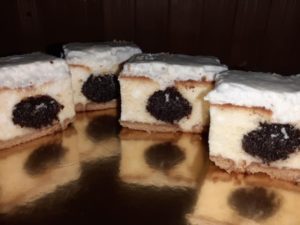Макова начинка. Брала готову (500 г), з якої сформувала кульки за величиною з горіх. Кожну макову кульку хаотично занурюємо в сирну масу. Випікаємо при температурі 180 градусів близько години. Зверху прикрасити збитими вершками або можна полити шоколадною глазур’ю. Виходить дуже ніжний та гарний у розрізі сирник.