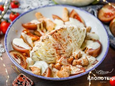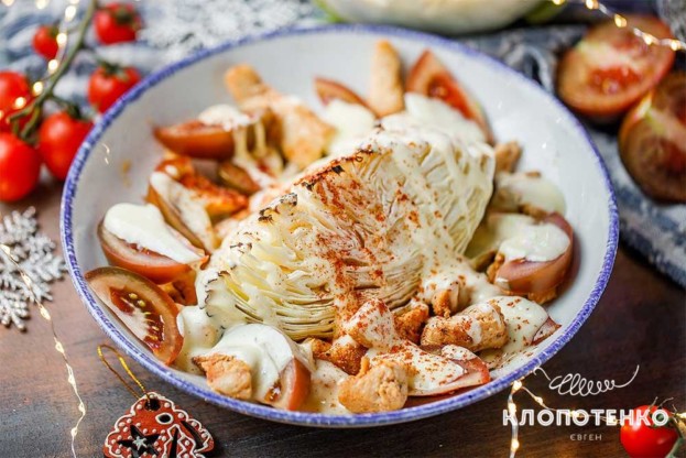 Капусту розріжте на 4 частини. Для двох повноцінних порцій салату будемо використовувати дві четвертинки. Зріжте із четвертинок капусти жорсткі качани. Скропіть зрізи соком одного лимона, рясно посоліть і полийте 1-2 ст. л. соняшникової олії. Запікайте капусту в духовці при температурі 220 градусів протягом 25-30 хвилин до появи опалин на зрізах. Куряче філе (2 шт.) помийте, очистіть від плівок і зайвого жиру і наріжте тонкими смужками. Замаринуйте смужки курки в 1 ч. л. паприки, 1 ч. л. гірчиці, солі і перці. Додайте 2-3 ст. л. соняшникової олії. Залиште маринуватися на 20 хвилин. Потім обсмажте філе на пательні до появи рум’яної скоринки. Запечену четвертинку капусти викладіть на тарілку. Наріжте томати (2 шт.) скибочками і викладіть поруч із капустою. Додайте до капусти з томатами обсмажену курку і полийте домашнім майонезом.