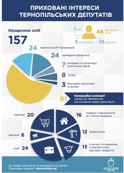 – Ми користувалися при цьому такими відкритими платформами, як Єдиний державний реєстр юридичних осіб, електронними деклараціями та сайтом міськради. Тернопільська база містить зараз 48 фігурантів, а саме: дані про міського голову, п’ять його заступників та 42 депутатів. Ми виявили, що на цю кількість фігурантів припадає 157 компаній, тобто в середньому по три компанії на одного. Однак тут слід відмітити, що деякі депутати не мають взагалі компаній, деякі ж володіють навіть 14 фірмами, – поділилася результатами роботи аналітик ГО “Антикорупційний штаб” Ольга Рибак.