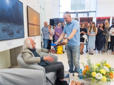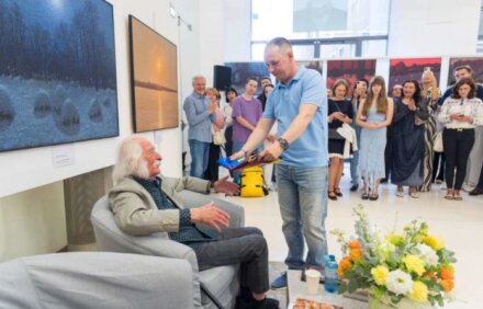 Виставка картин Івана Марчука у Відні. Військовий передає художнику прапор із фронту, з підписами українських захисників. Фото Марини Шкіндер