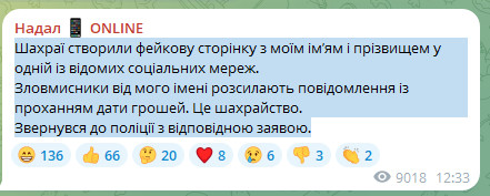 – Зловмисники від мого імені розсилають повідомлення із проханням дати грошей. Це шахрайство.