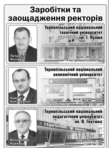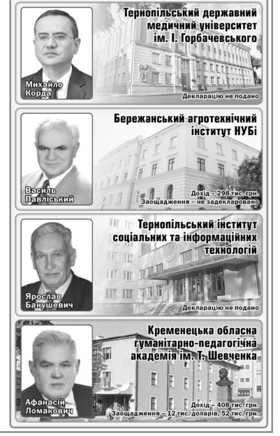 Практично кожен із цих закладів очолюють освітяни зі стажем у не один десяток років. Усе своє життя вони поклали на вівтар освіти. Що ж отримали взамін? Це «Номер один» спробувала з’ясувати, проаналізувавши декларації керівників ВНЗ.