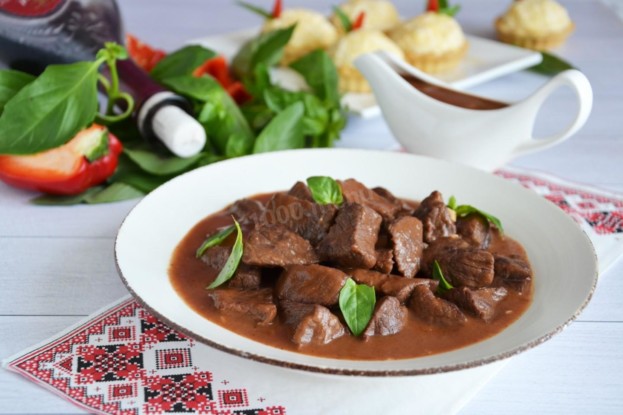 Телятина, тушкована в червоному вині, — це неймовірно смачно! Страва виходить пікантна, має багатий, насичений смак і чудовий аромат!