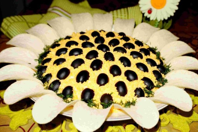 Декор салату − це відповідальний крок. Тому розріжте маслини навпіл упоперек і викладіть їх поверх кукурудзи, повністю її закриваючи. По колу страви викладаються чіпси у вигляді квіткових пелюсток. Можна додати порізану зелень або цілі гілочки кропу чи петрушки.