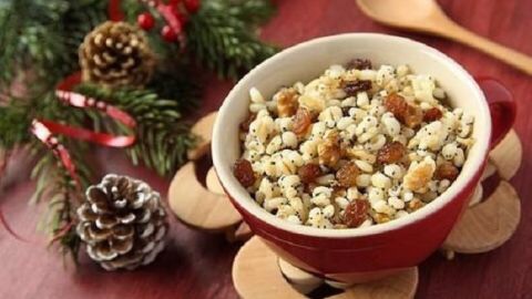 Булгур залити водою удвічі більшого об’єму, ніж крупи, зварити на маленькому вогні, остудити. Родзинки залити окропом, щоби набухли, опісля воду злити. Мак запарити окропом, розтерти з цукром у макітрі. Горіхи підсмажити на сухій пательні й посікти. До булгуру додати розтертий мак, посічені горіхи, заправити медом і все ретельно перемішати.