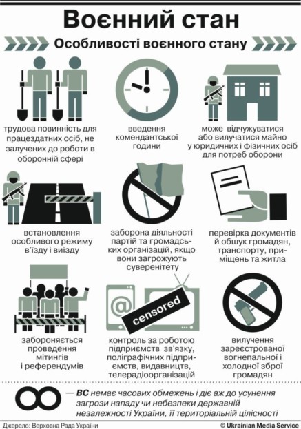 Вперше в історії незалежної України, щоб зупинити агресію Росію, на частині території нашої держави введено воєнний стан. Для більшості українців це словосполучення викликає паніку. Наші журналісти спробували розібратися, що таке воєнний стан, які обмеження прав варто чекати українцям, чи вплине він на майбутні вибори і роботу ЗМІ та чи буде масова мобілізація.