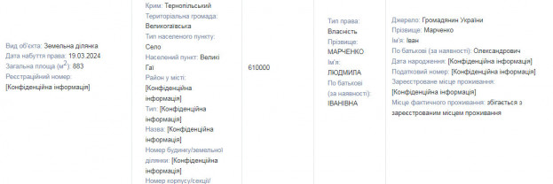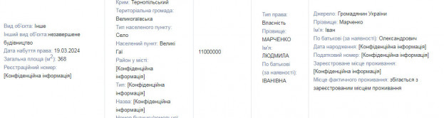 Людмила Марченко стала власницею ділянки площею 883 м2 у селі Великі Гаї. Вказана вартість – 610 000 грн. Також депутатка тепер володіє незавершеним будівництвом площею 368 м2 також у Великих Гаях. Вартість – 11 000 000 грн.