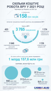 За підрахунками «Слово і діло», один українець, який працює, у 2021 році витратить на утримання Верховної ради в середньому 158 гривень (наприклад, в 2017 році ця цифра була вдвічі менше). Сюди входять зарплати народних депутатів та їхніх помічників, забезпечення роботи парламенту і утримання його майна.