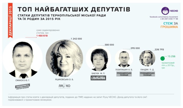 Загалом рух «Чесно» здійснює аналіз декларацій депутатів по всій країні. Тернопільщина у цьому плані відзначається стабільністю. У місцевій раді немає депутатів, чиї офіційні доходи перевищують позначку 10 млн. грн., та депутатів, які декларують нульові доходи, що, власне, є звичною практикою для інших регіонів.