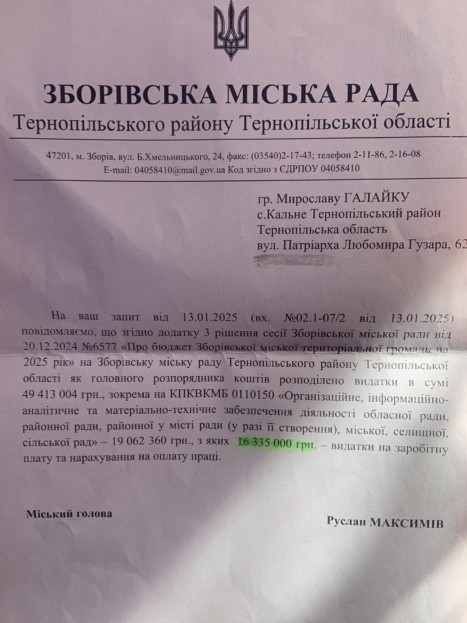 Для порівняння, лише на премії у 2024 році витратили 2,36 мільйона гривень. Чи могли б ці кошти спрямувати на важливіші потреби громади – питання, яке залишається відкритим. Про це повідомляє житель села Кальне на Зборівщині Мирослав Галайко, який отримав відповідь на свій запит у міську раду Зборова.