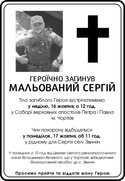 Тіло загиблого Героя чортків’янина Сергія Мальованого зустрічатимуть у неділю, 16 жовтня, о 12 год. у Соборі верховних апостолів Петра і Павла, м. Чортків.