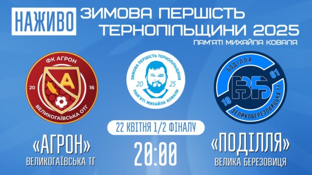 Сьогодні, 22 квітня, у матчі «Агрон» (В. Гаї) – «Поділля» (В. Березовиці) визначиться другий фіналіст Зимової першості Тернопільщини з футболу 2025 року пам’яті Михайла Коваля.