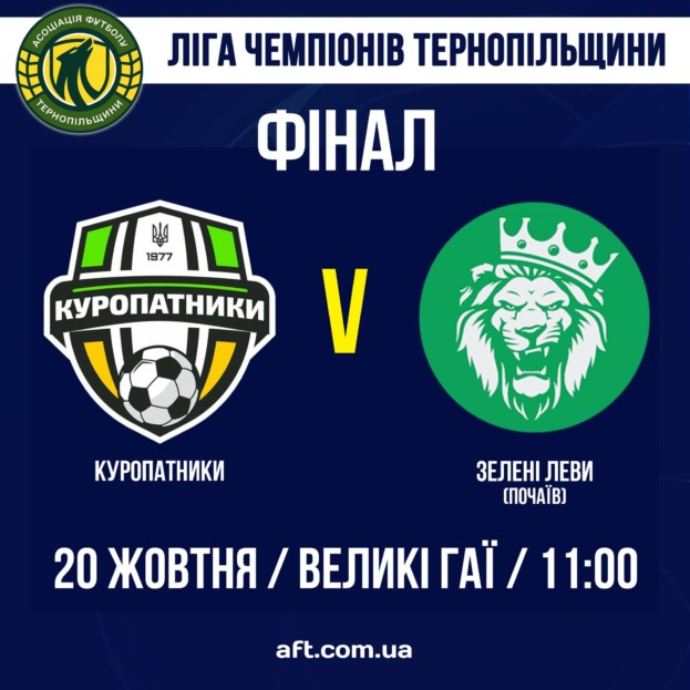 Сьогодні, 20 жовтня, у селі В. Гаї, що біля Тернополя на місцевому стадіоні відбудеться фінальний поєдинок Ліги чемпіонів Тернопільщини сезону-2023/24. Вперше за титул у вирішальному матчі змагатимуться команди Тернопільського та Кременецького районів – ФК «Куропатники» та «Зелені леви» (Почаїв). Початок зустрічі о 11 годині.