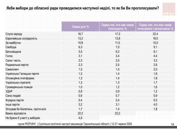 Із виборців, які визначилися і готові прийти на вибори, близько 22% готові віддати свої голоси за «Слугу народу», 18% – за «Європейську солідарність» та 15% – «ЗА МАЙБУТНЄ». Також долають прохідний бар’єр зі значно меншими показниками «Свобода» і «Батьківщина», набираючи близько 9% та 8% відповідно.