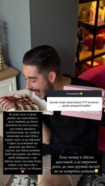 Я дуже радий, що вона пішла з мого життя, це довго доходило до моєї голови, але потім прийшло усвідомлення, що людина повністю не моя! Я їй в першу чергу за це вдячний! І зараз за останній час зрозумів, що дійсно є увагою, що дійсно робить тебе щасливим, що дійсно тебе підтримує і що дійсно може змусити бути собою, а не тим, хто є зручністю збоку і не більше. Тому тепер я дійсно щасливий, а ці втрачені роки, це лиш крутий досвід, як не потрібно робити”, – підсумував артист.