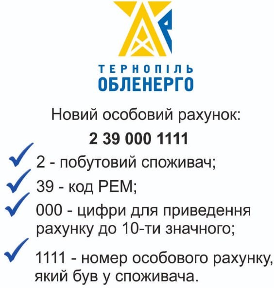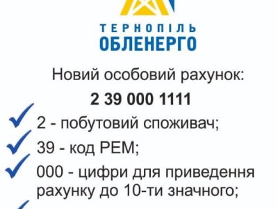 АТ «Тернопільобленерго» повідомляє про те, що з 15.05.2024 року змінені особові рахунки на 10-ти значний формат, як побутовим, так і юридичним споживачам.