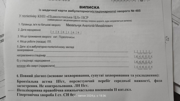 Під час обстеження пана Михальчука лікарям були надані виписки з його медичної документації, які містили діагнози його основних хронічних захворювань. Діагноз: бронхіальна астма III ступеня, легенева недостатність II ступеня.