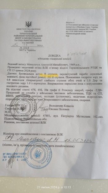 15 травня 2024 року мешканець Тернопільщини Анатолій Михайлович Михальчук (1969 року народження) з діагнозом бронхіальна астма III ступеня та легенева недостатність II ступеня проходив медичний огляд ВЛК у 5-му відділі РТЦК та СП (смт Підволочиськ). Без додаткової перевірки комісія ВЛК визнала А. Михальчука придатним до виконання службових обов’язків, а через кілька днів його мобілізували. Під час навчальних зборів на Рівненщині в чоловіка було загострення хвороби. Нині він перебуває на стаціонарному лікуванні в госпіталь. Про цю історію розповів громадський активіст Михайло Іваненко з Тернополя.